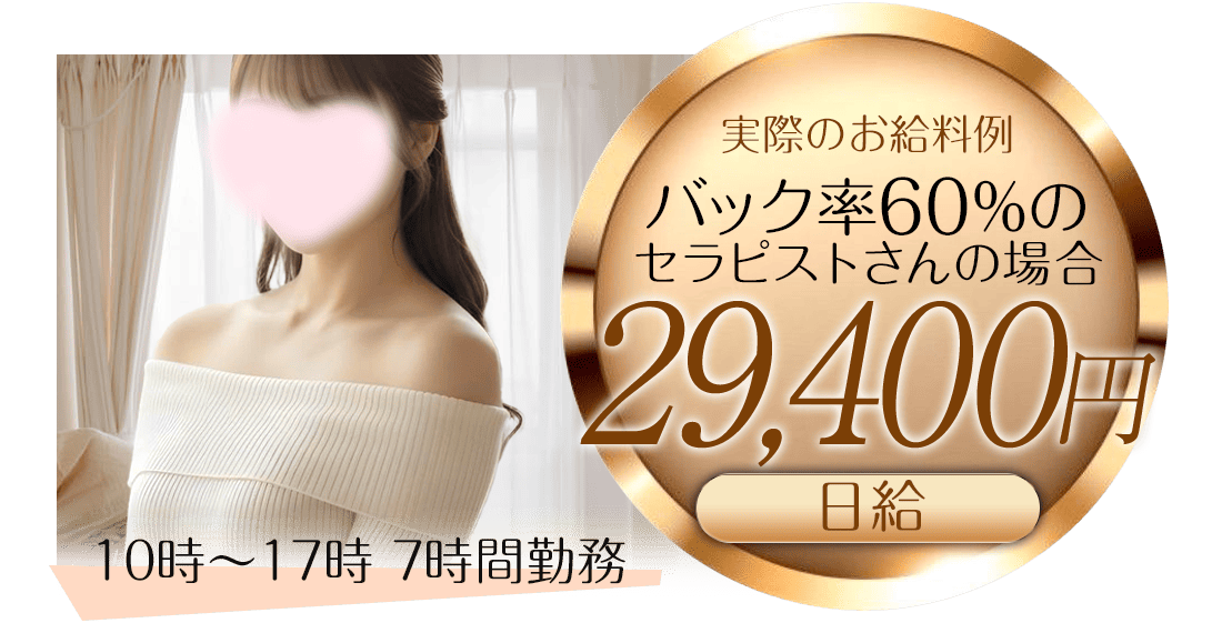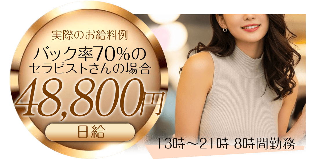 | 19:30〜21:00 90分施術 | 15,000円×70%+本指名(2,000円)=12,500円 |